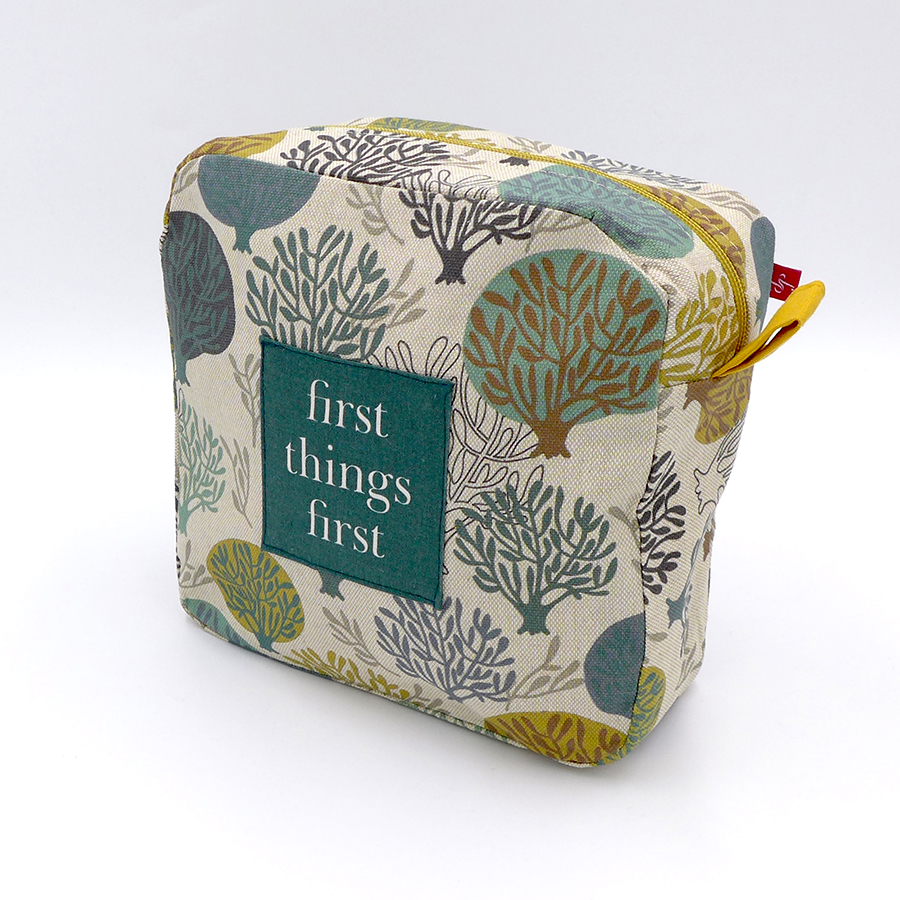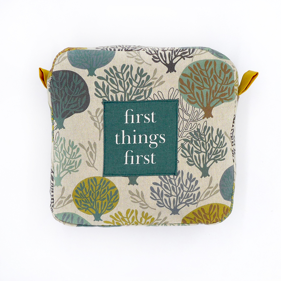 – ozdobiona na zewnątrz naszywką „first things first”