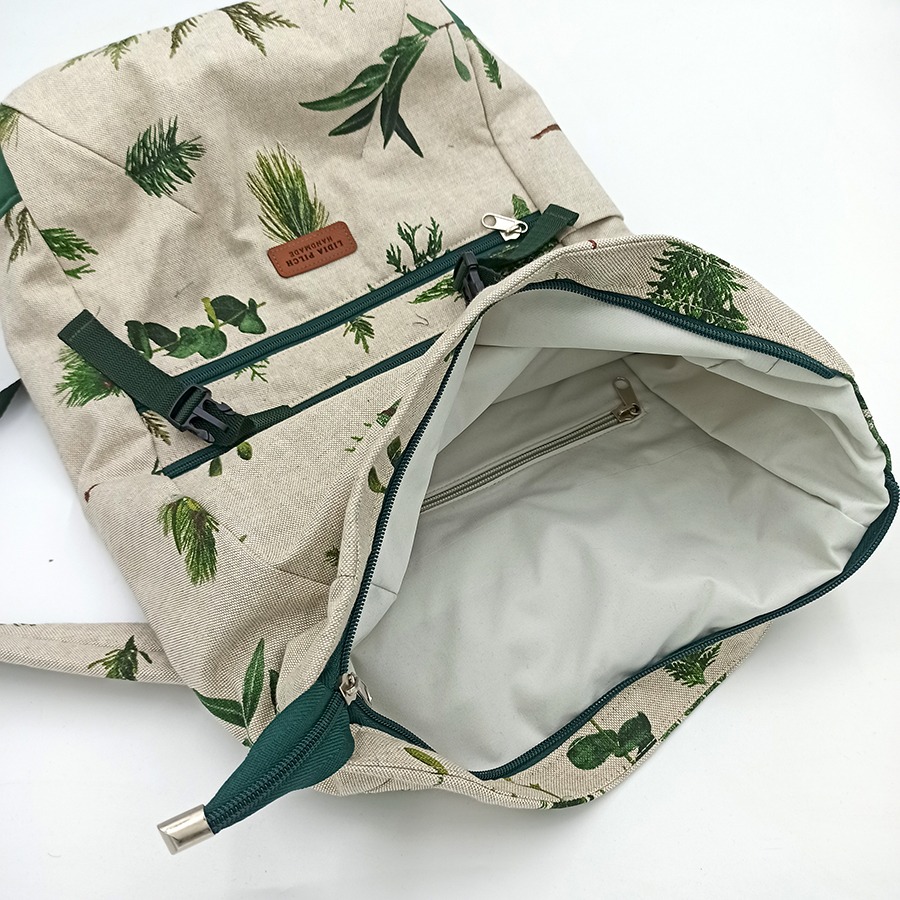 Plecaki szyję w dwóch opcjach: z naturalnego bawełnianego (z niewielką domieszką poliestru) grubego, wzmocnionego płótna oraz w wersji z tkaniny wodoodpornej. Istnieje możliwość wykonania personalizowanego projektu – z wybranej tkaniny i określonych dodatków oraz w większym rozmiarze L. Jeśli interesuje Cię indywidualny projekt, napisz na kontakt@podarunek.art.