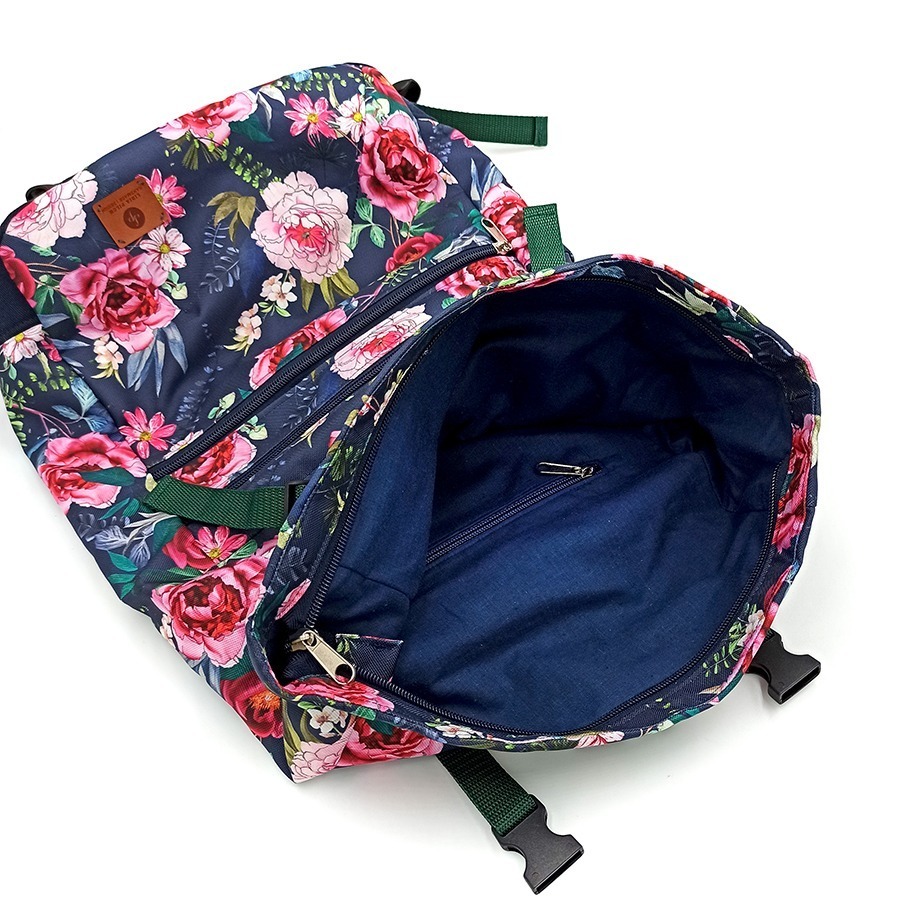 Klasyczny kobiecy wzór z pięknymi kwiatami na głębokim granacie. Ponadczasowe połączenie tych odcieni doskonale wygląda w tym modelu plecaka kurierskiego. W końcu bycie romantyczną wcale nie wyklucza praktycznego podejścia do życia i upodobania do porządku. A plecak z powodzeniem pomieści i kocyk i nawet bardzo grubą powieść na plenerowe czytanie, o prowiancie nie wspominając!