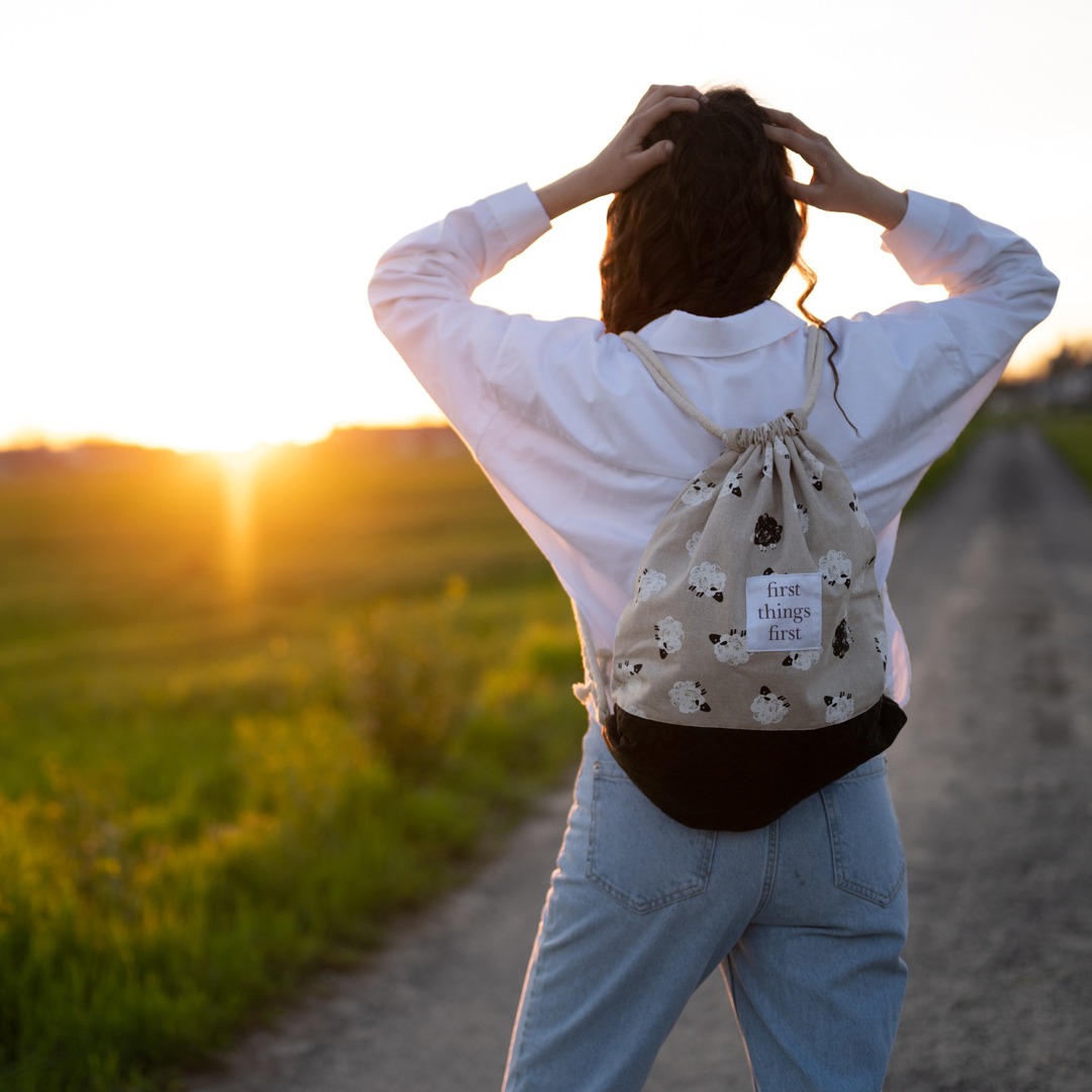 – z przodu ozdobiony jest naszywką z hasłem „first things first”