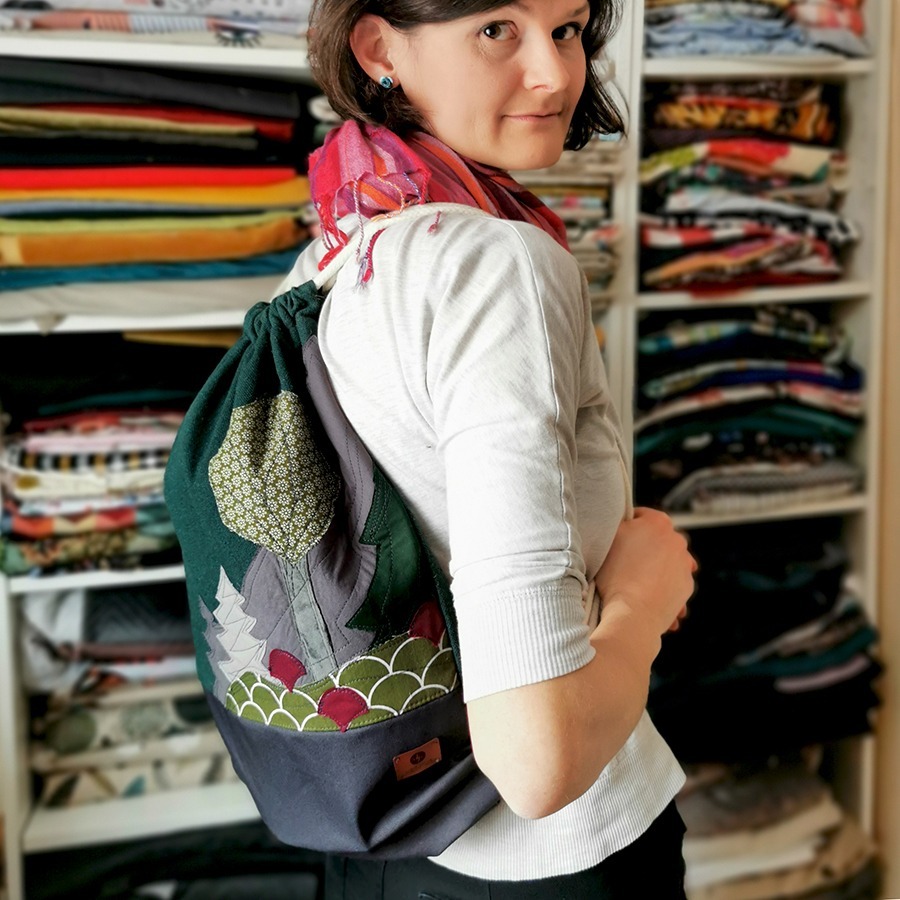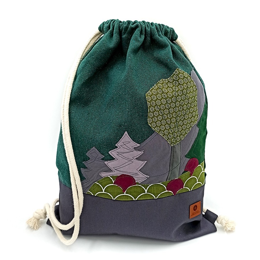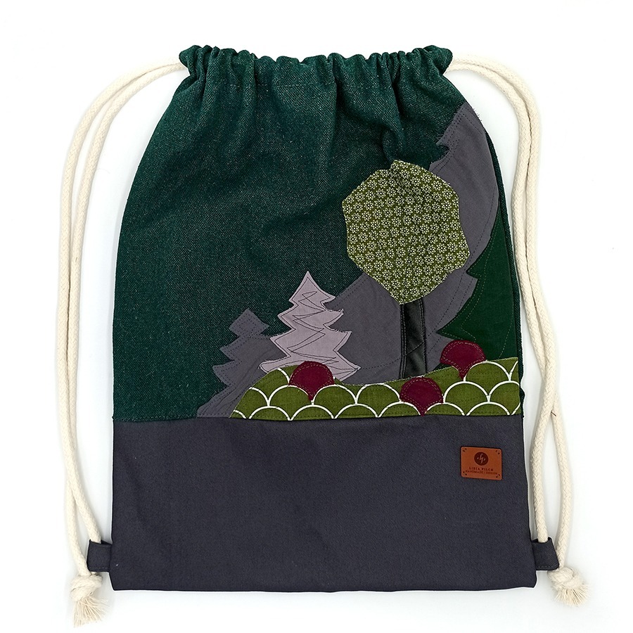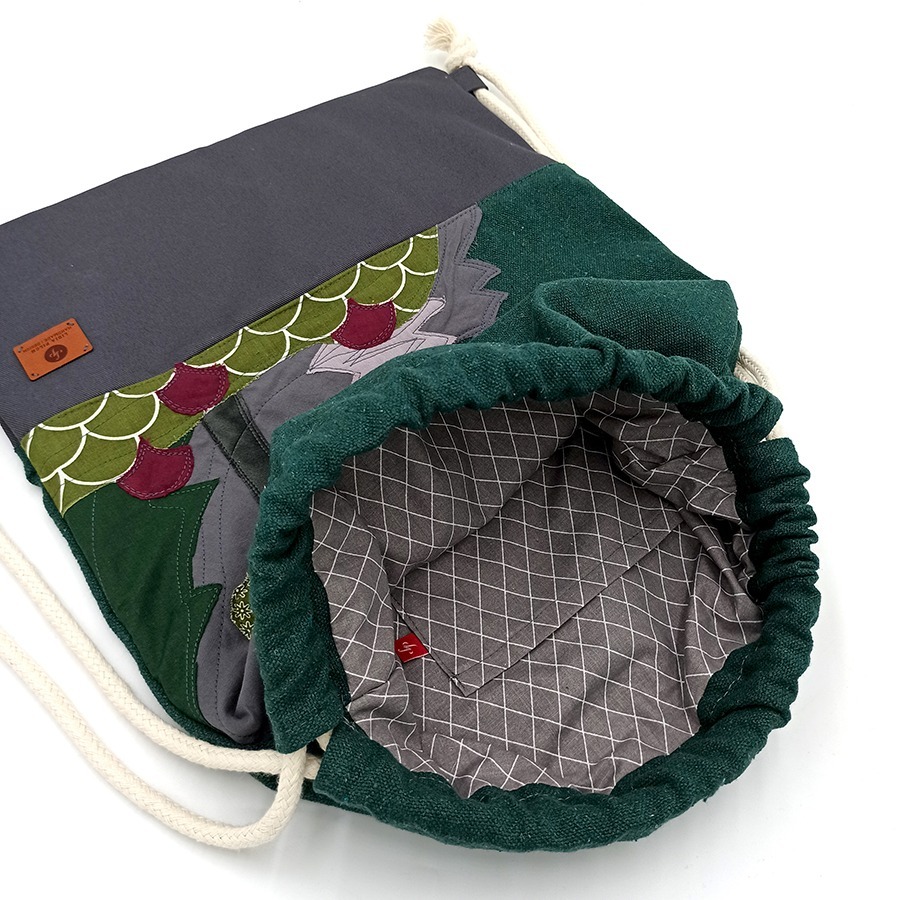 Leśna zieleń, soczyste odcienie mchu czy liści – to wszystko zakomponowane w wydaniu EKO plecaka. Leśną aplikację tworzą bowiem kawałki, a właściwie ścinki różnych tkanin wykorzystywanych w mojej pracy. Plecak nie tylko naturalnie wygląda, ale jest też wykonany z naturalnych materiałów. Grube płótno w połaczeniu ze sztywnym bawełnianym spodem i bawełnianą podszewką bardzo elegancko się komponują. Przy tym niezmiennie jest wygodny, pojemny i lekki.