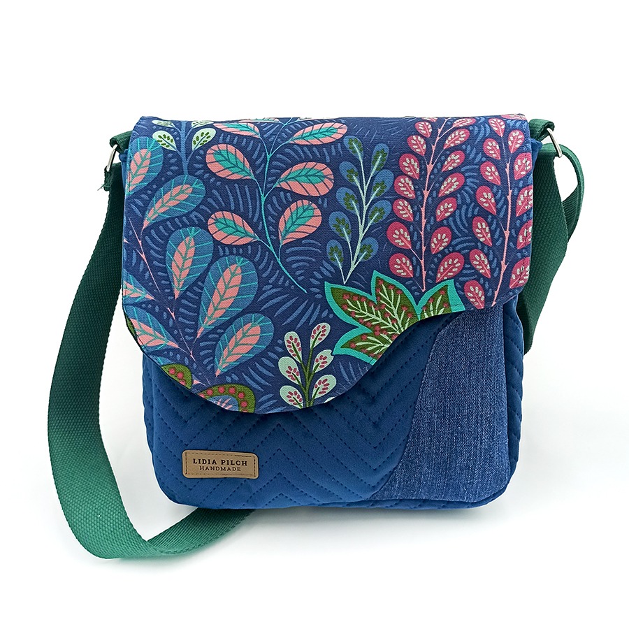 Błękitno-turkusowa torebka z pięknym wzorem roślinnym ucieszy nie tylko marzycieli. Nie jest to jednak nudne połączenie. Mamy delikatne akcenty cieplejszej zieleni, element naturalnego jeansu, a wszystko  tworzy niezmiennie  praktyczną i wygodną listonoszkę. Jest to doskonałe rozwiązanie dla osób dbających o komfort i oryginalny styl.  Torba pomieści niezbędne gadżety a przy tym bardzo atrakcyjnie wygląda.