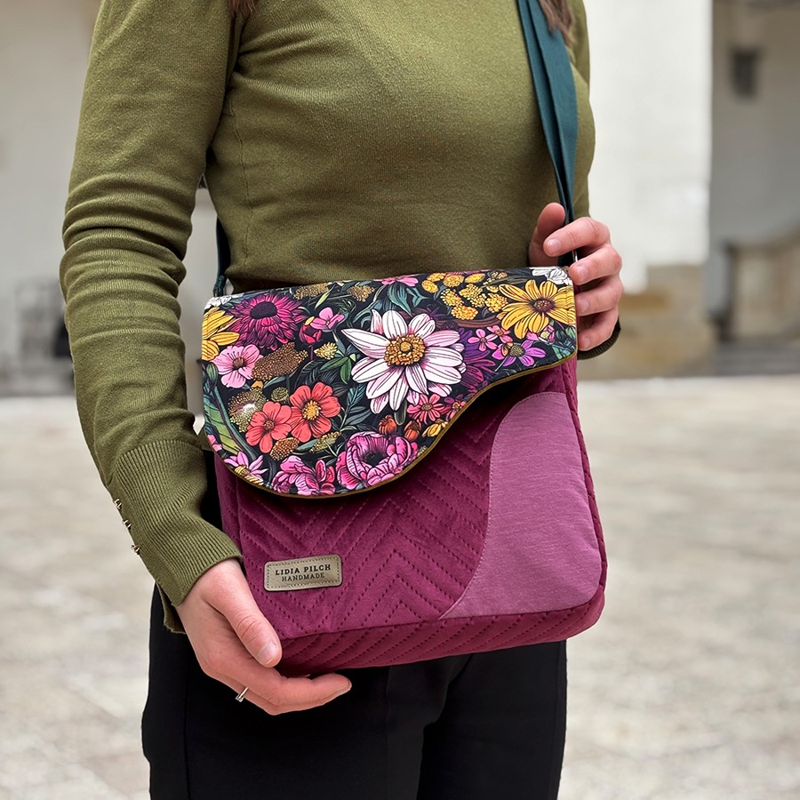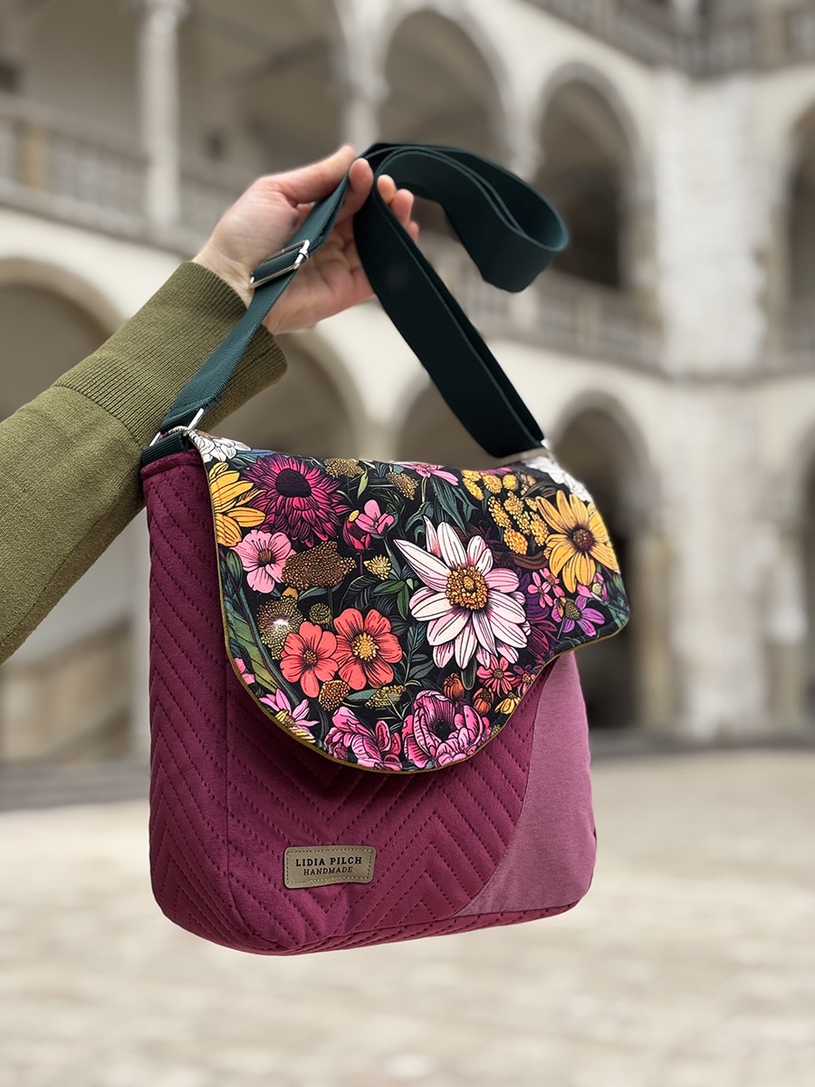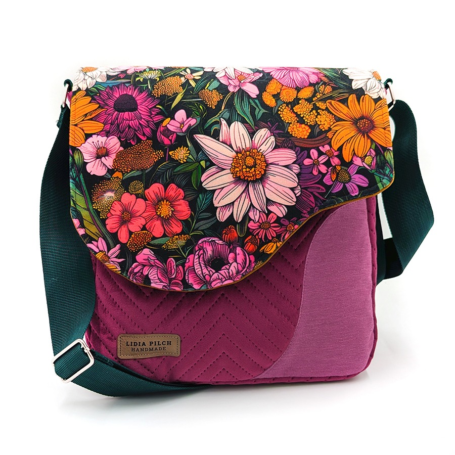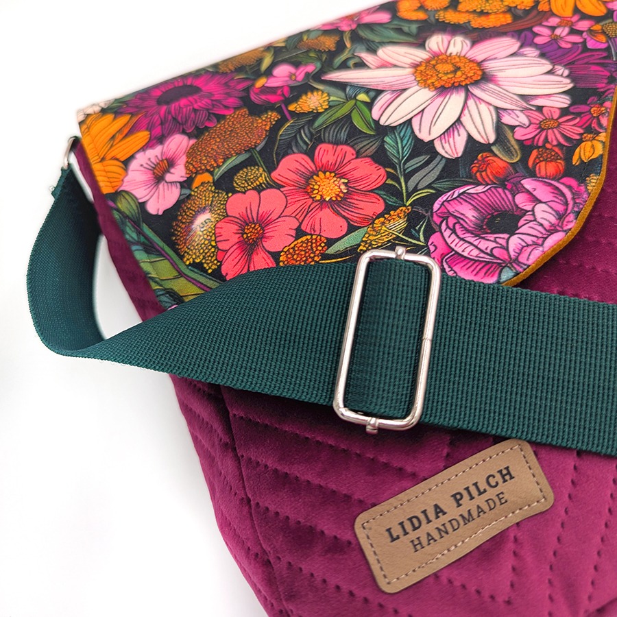 Stylowa i funkcjonalna torebka listonoszka damska handmade, uszyta z niezwykle miękkiego, pikowanego aksamitu syntetycznego w eleganckim odcieniu. Klapę zdobi efektowny, kwiatowy wzór wykonany na welurze tapicerskim, który nadaje torbie wyjątkowego, artystycznego charakteru.