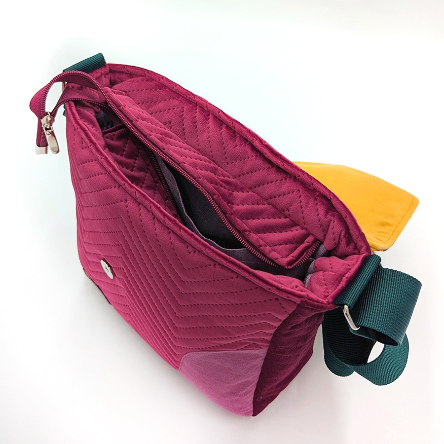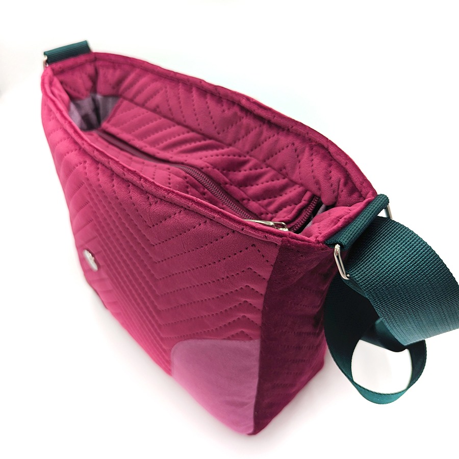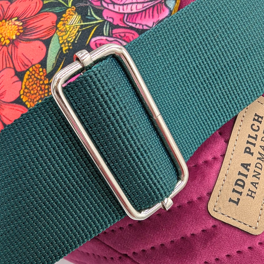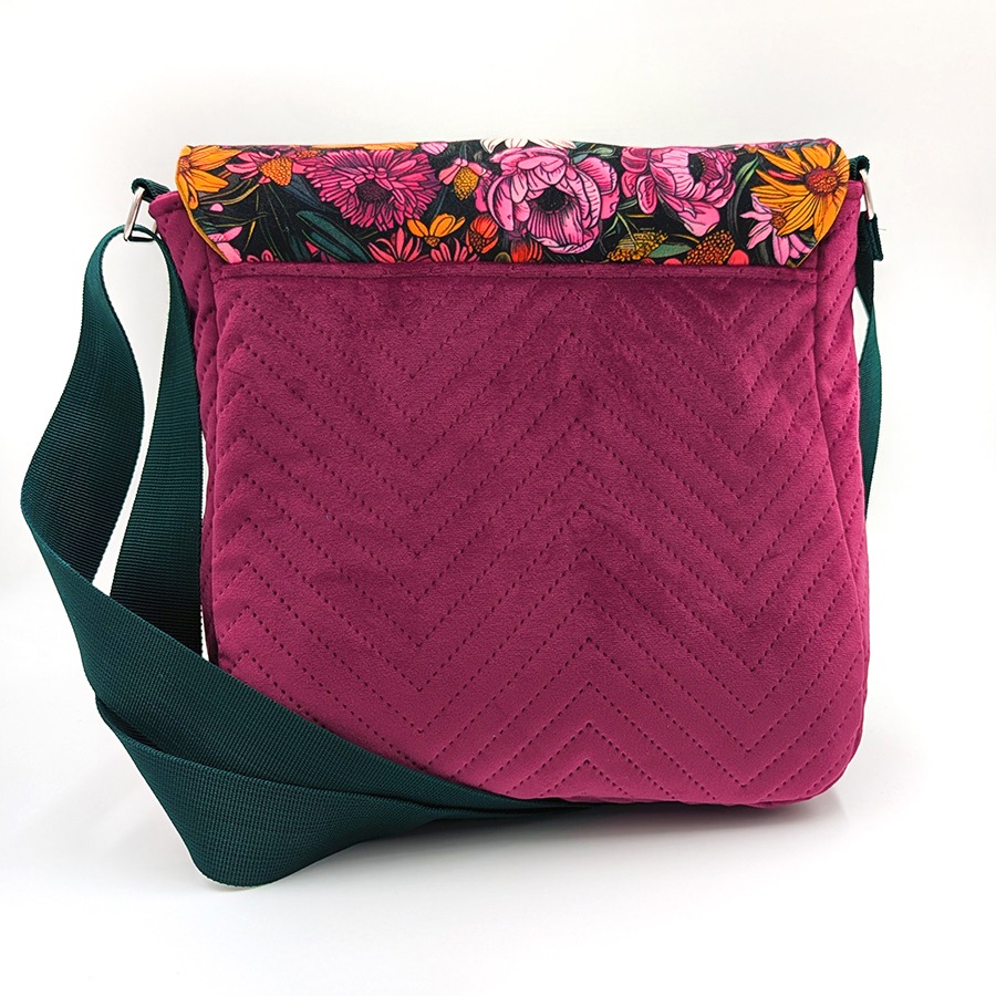 Stylowa i funkcjonalna torebka listonoszka damska handmade, uszyta z niezwykle miękkiego, pikowanego aksamitu syntetycznego w eleganckim odcieniu. Klapę zdobi efektowny, kwiatowy wzór wykonany na welurze tapicerskim, który nadaje torbie wyjątkowego, artystycznego charakteru.