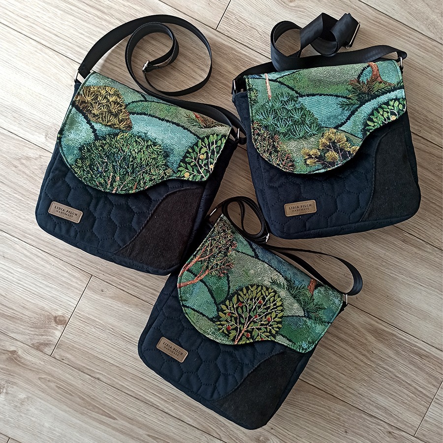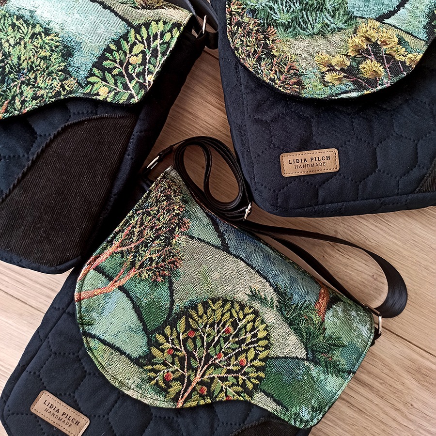 Piękna i oryginalna listonoszka łącząca czerń z naturalnymi odcieniami zieleni. Uroku dodaje również tkana, gobelinowa tkanina na klapie, a każdy model tego wzoru jest niepowtarzalny.