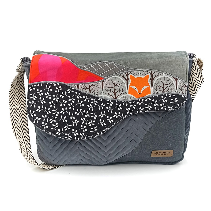 – klapa: velvet z aplikacją uszytą z różnych rodzajów wzorzystych tkanin, klapa posiada zapięcie magnetyczne