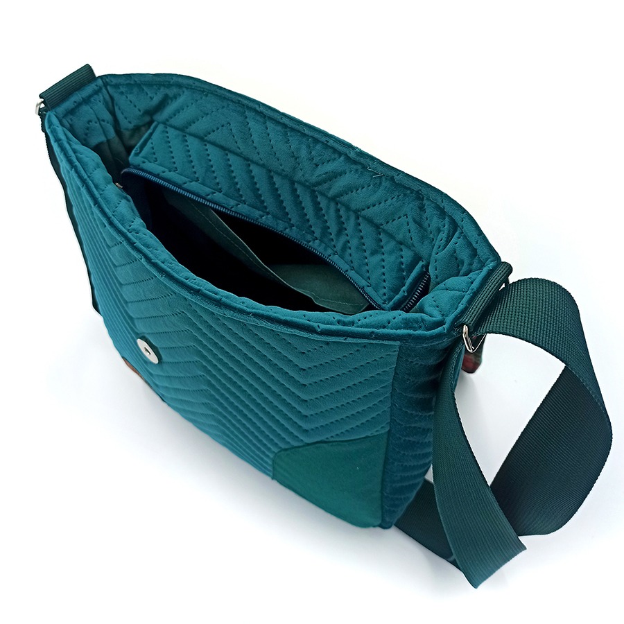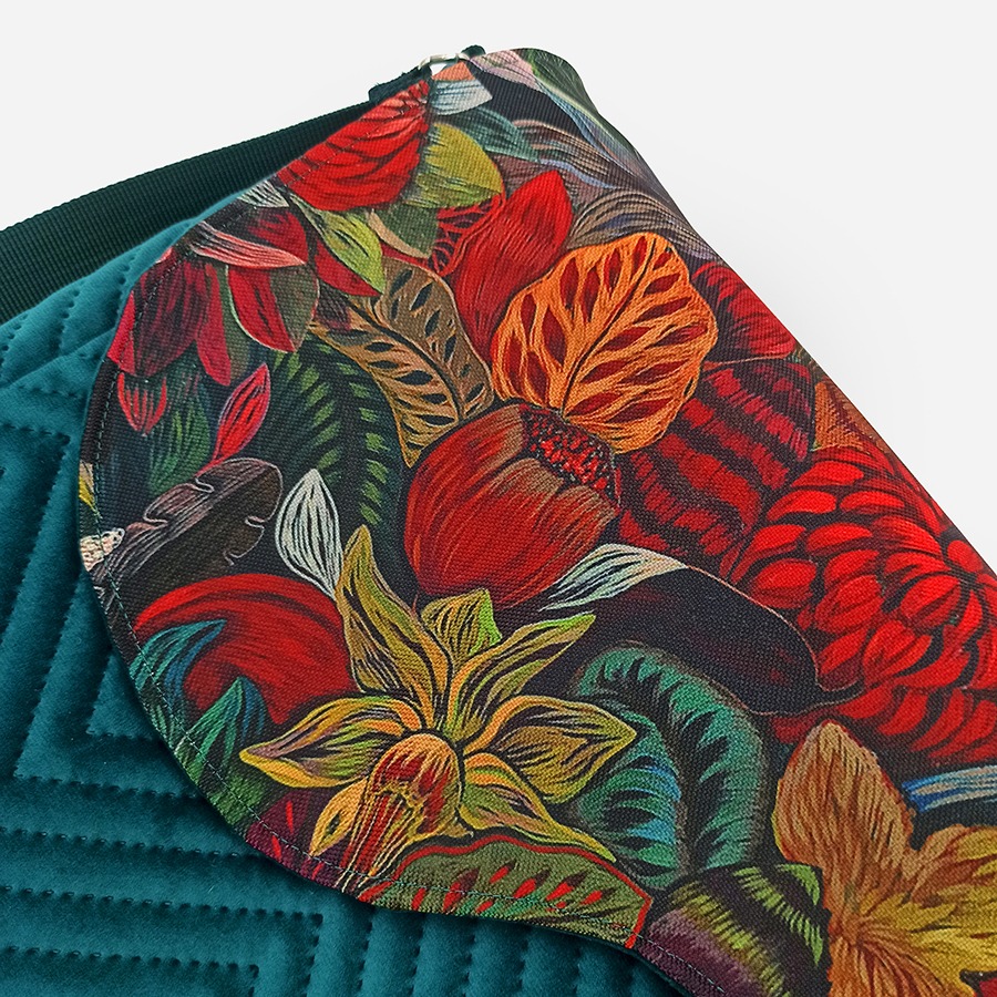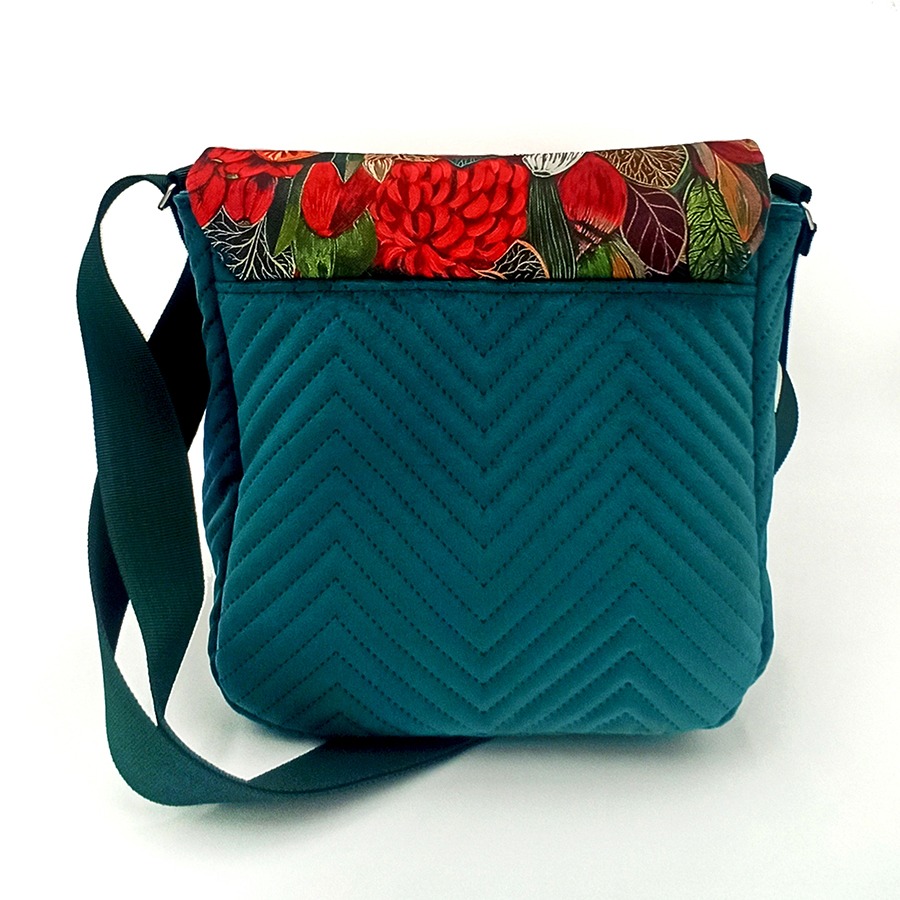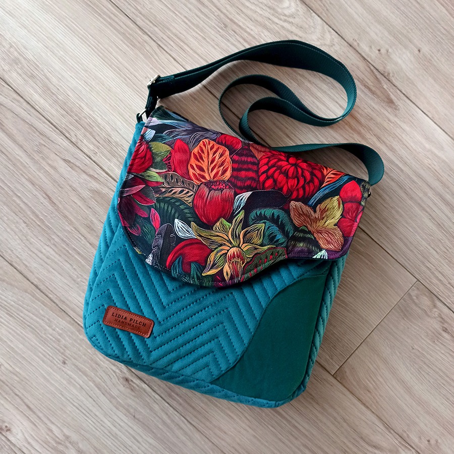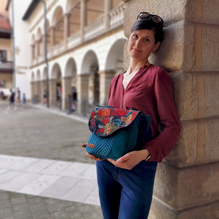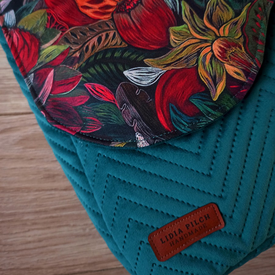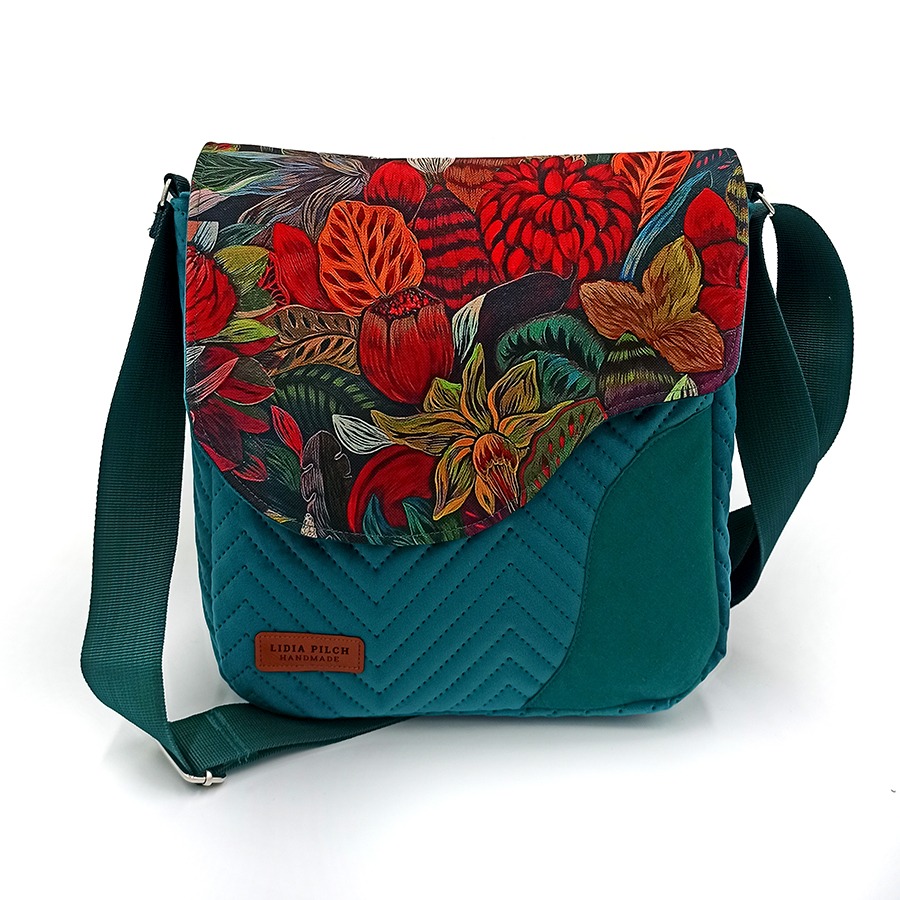 Oryginalny i wyrazisty wzór tkaniny listonoszka ta zawdzięcza niezwykłej artystce Justynie Stoszek (https://forestforever.eu/pl/start-pl/). To fragment jednego z jej obrazów, które pojawiły się niedawno w przestrzeni publicznej większych miast. Artystka promuje naturę, która wpisuje się w miejski pejzaż.