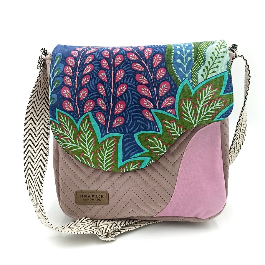 Wersja z różem błękitno-turkusowej torebki ze wzorem roślinnym. Kobieca, oryginalna i w pięknych odcieniach. Wszystko  tworzy niezmiennie  praktyczną i wygodną listonoszkę. Jest to doskonałe rozwiązanie dla osób dbających o komfort i oryginalny styl.  Torba pomieści niezbędne gadżety a przy tym bardzo atrakcyjnie wygląda.