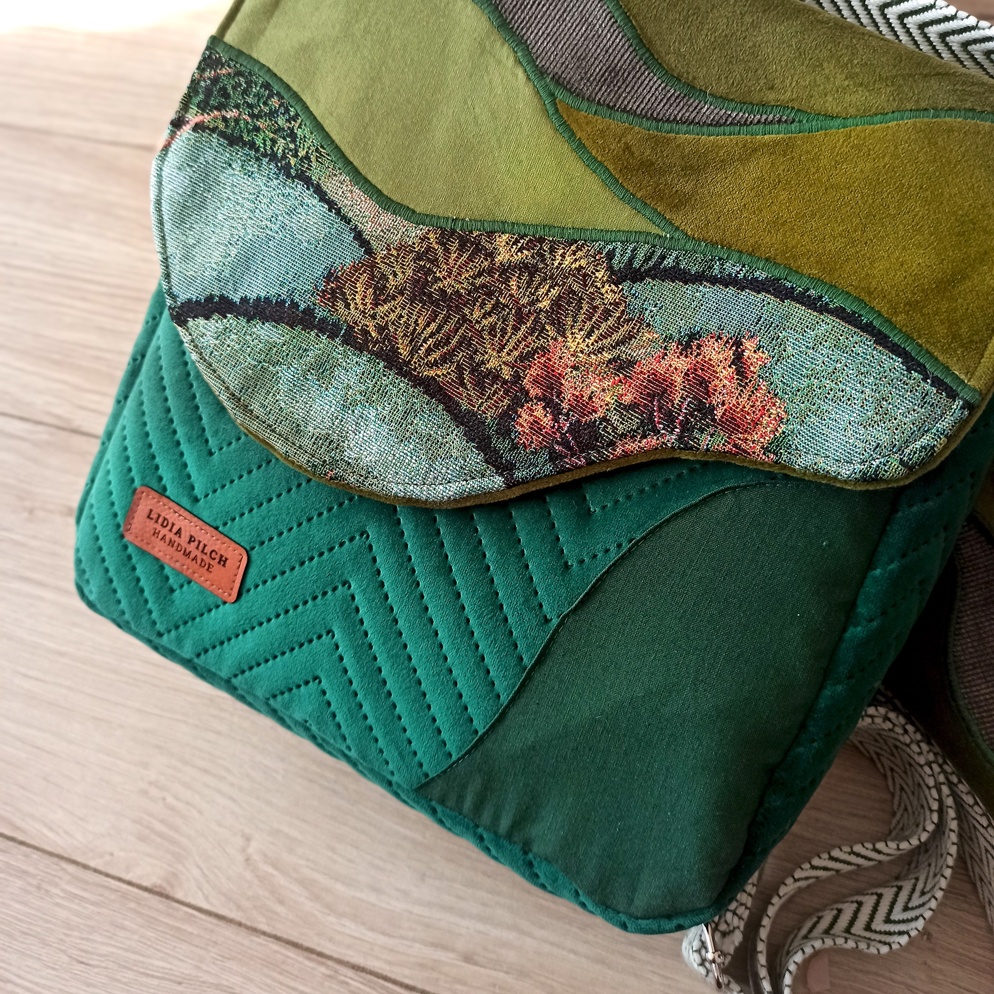 – klapa: aksamit i sztruks z aplikacją uszytą z różnych rodzajów wzorzystych tkanin, zapięcie magnetyczne