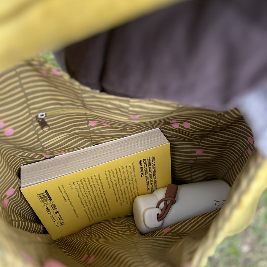 - Przemyślane wnętrze: Środek wykończony jest bawełnianą podszewką w drobny, kontrastowy wzór. Wewnątrz znajdziesz kieszonkę na zamek, idealną na drobiazgi, których nie chcesz szukać na dnie torby.