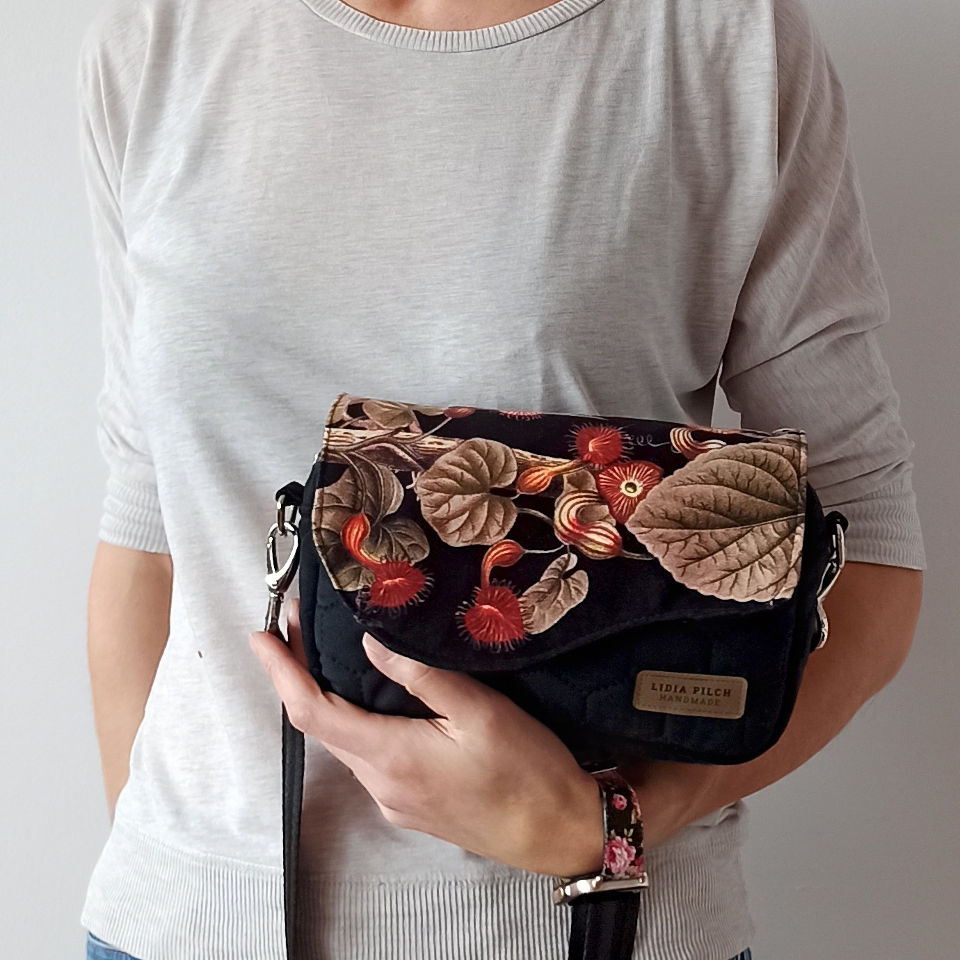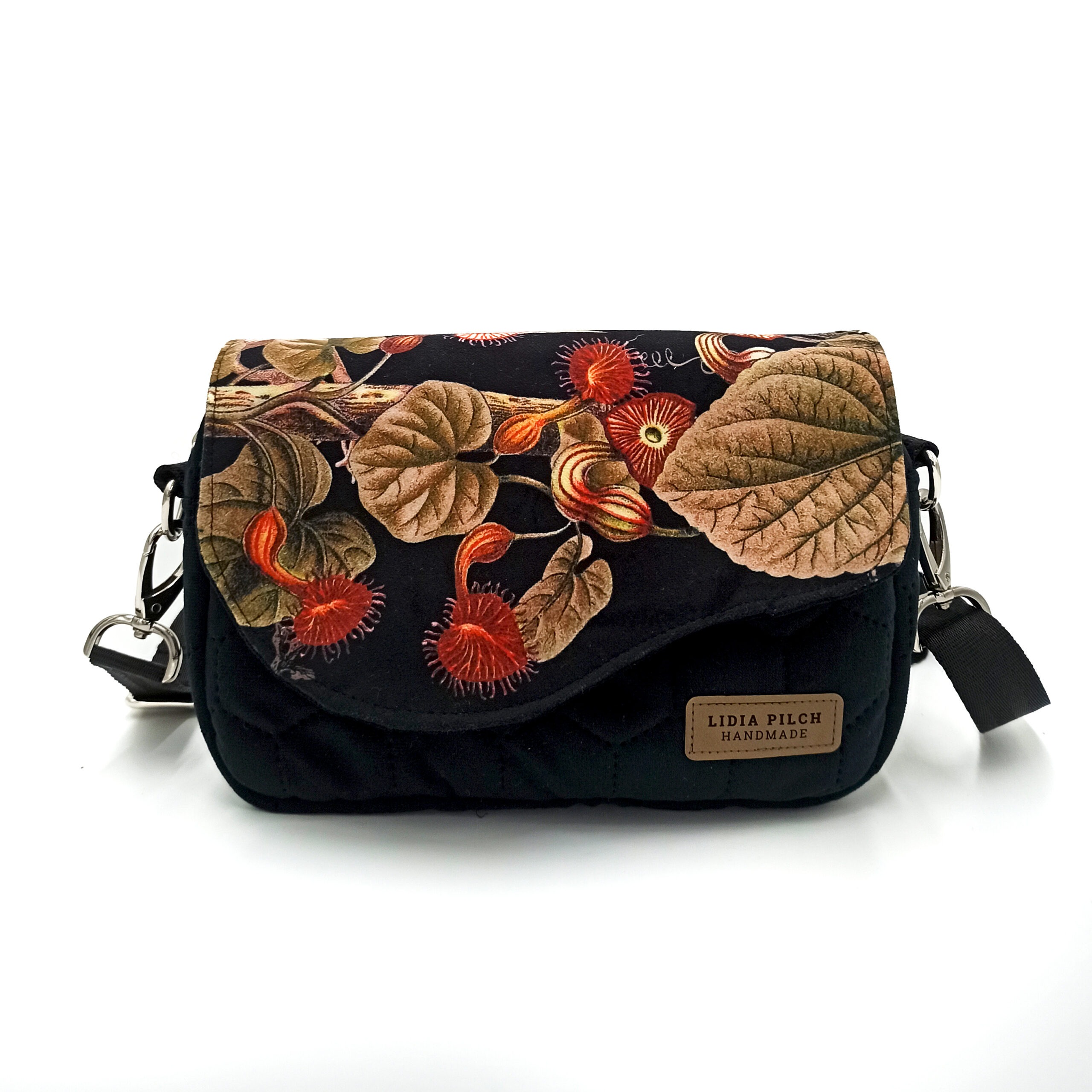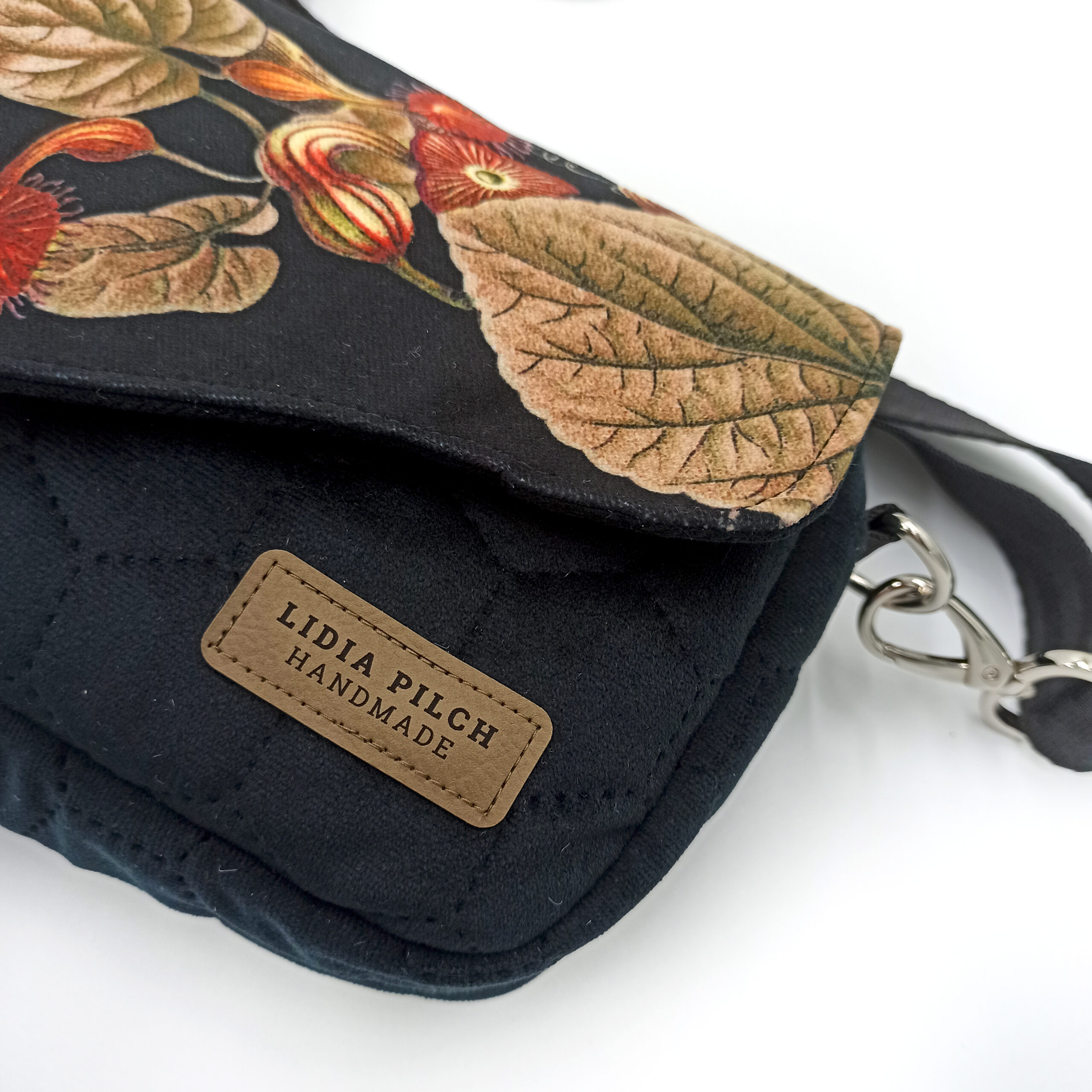 Elegancka, nietuzinkowa i niezwykle miękka welurowa torebka z pięknym kwiatowym motywem. Bardzo prosta w formie i kształcie, klasyczna torebka typu box posiada niewątpliwy urok. Jest bardzo zgrabna i praktyczna. Użyte materiały są niezwykle przyjemne w dotyku i wytrzymałe, a jej rozmiary z powodzeniem pozwolą zmieścić to, co najbardziej potrzebne – telefon, okulary, dokumenty, portfel. No i z całą pewnością lusterko ze szminką również znajdą tam przestrzeń dla siebie.