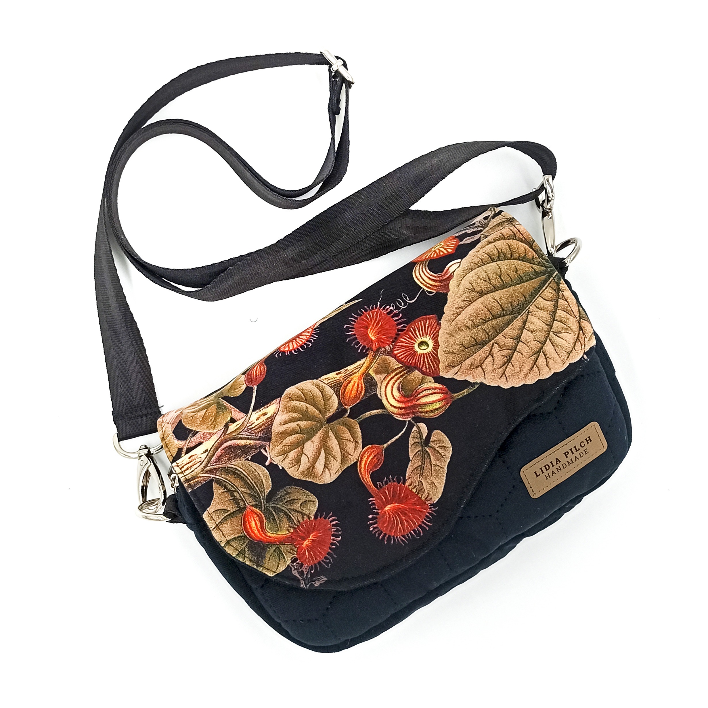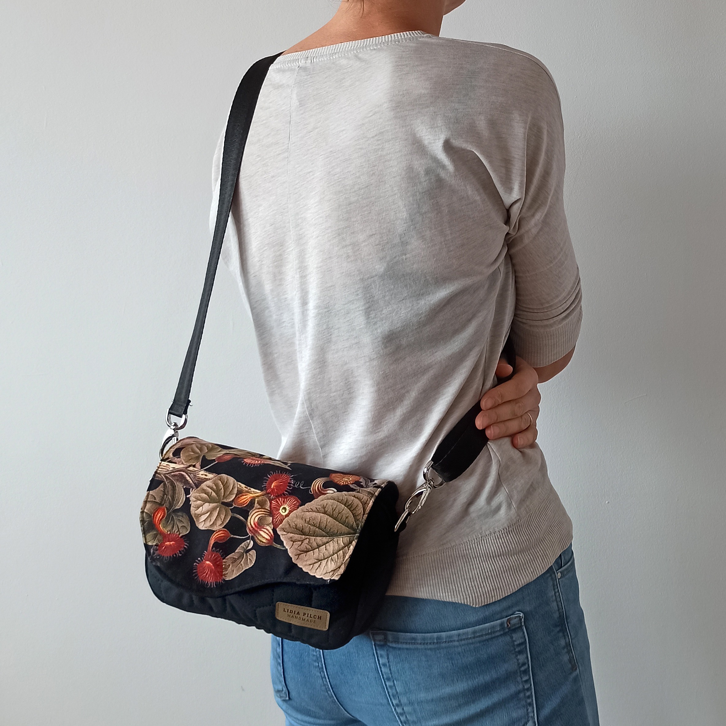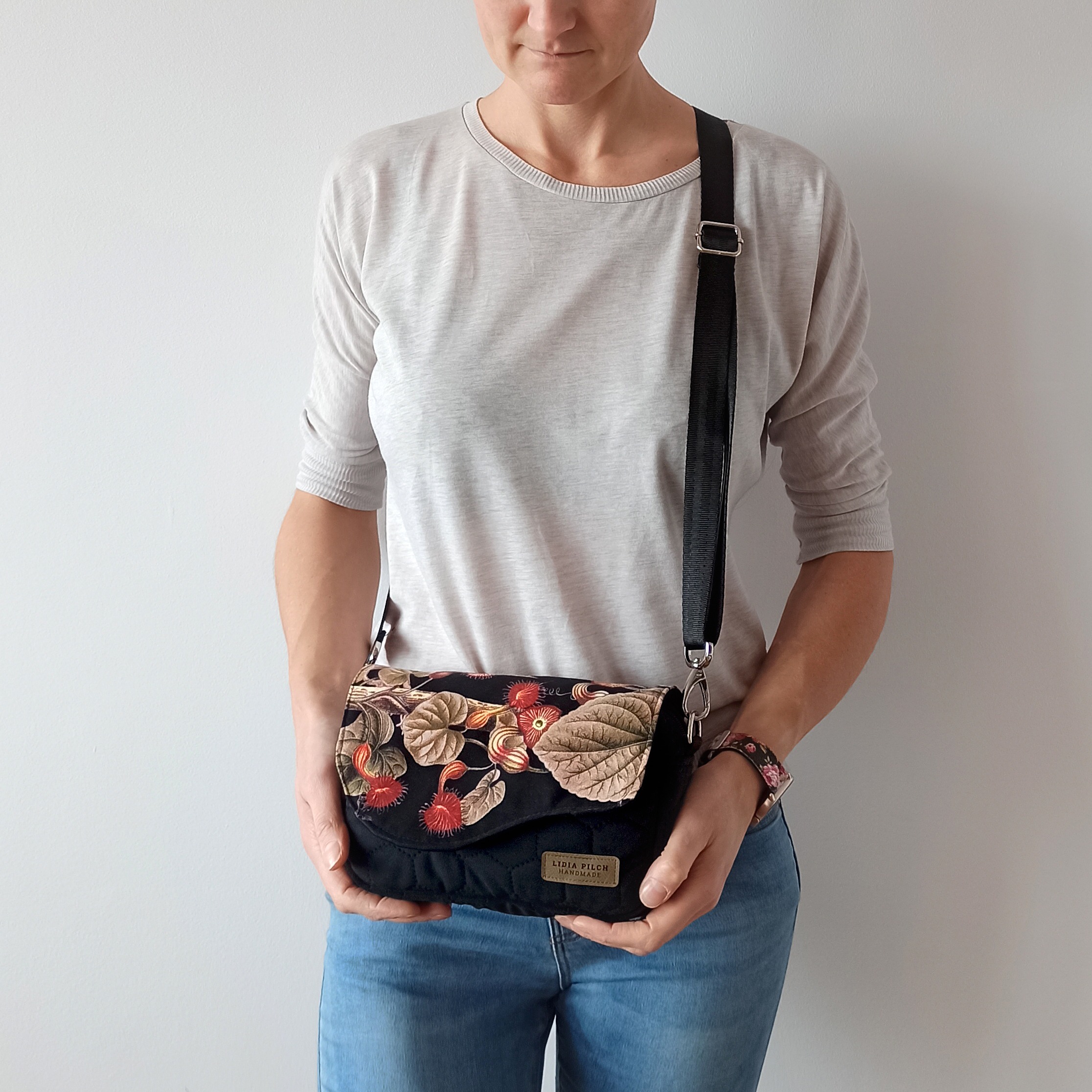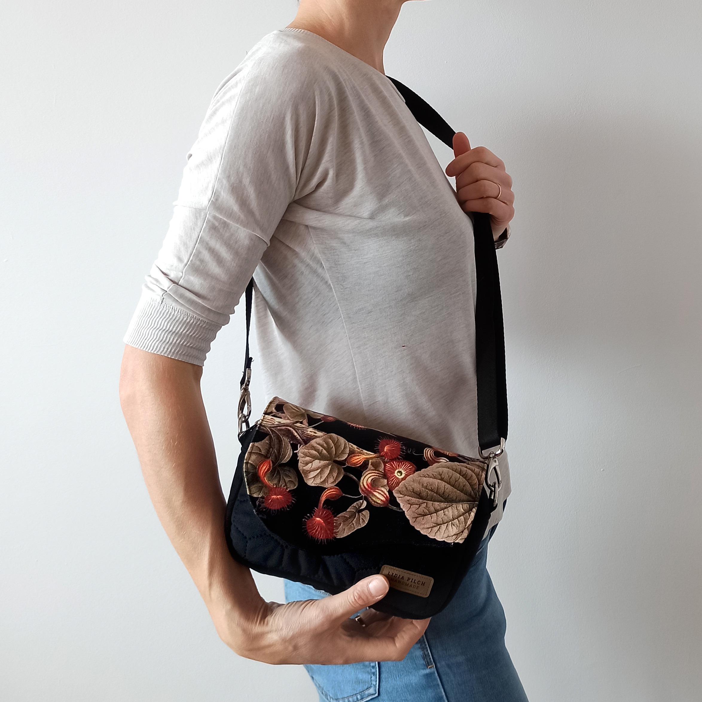 Elegancka, nietuzinkowa i niezwykle miękka welurowa torebka z pięknym kwiatowym motywem. Bardzo prosta w formie i kształcie, klasyczna torebka typu box posiada niewątpliwy urok. Jest bardzo zgrabna i praktyczna. Użyte materiały są niezwykle przyjemne w dotyku i wytrzymałe, a jej rozmiary z powodzeniem pozwolą zmieścić to, co najbardziej potrzebne – telefon, okulary, dokumenty, portfel. No i z całą pewnością lusterko ze szminką również znajdą tam przestrzeń dla siebie.